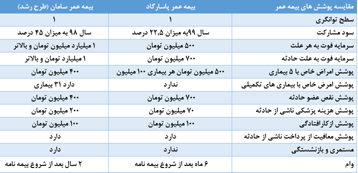 در زیر دو شرکت بیمه عمر از نظر پوشش ها با یکدیگر مقایسه شده اند